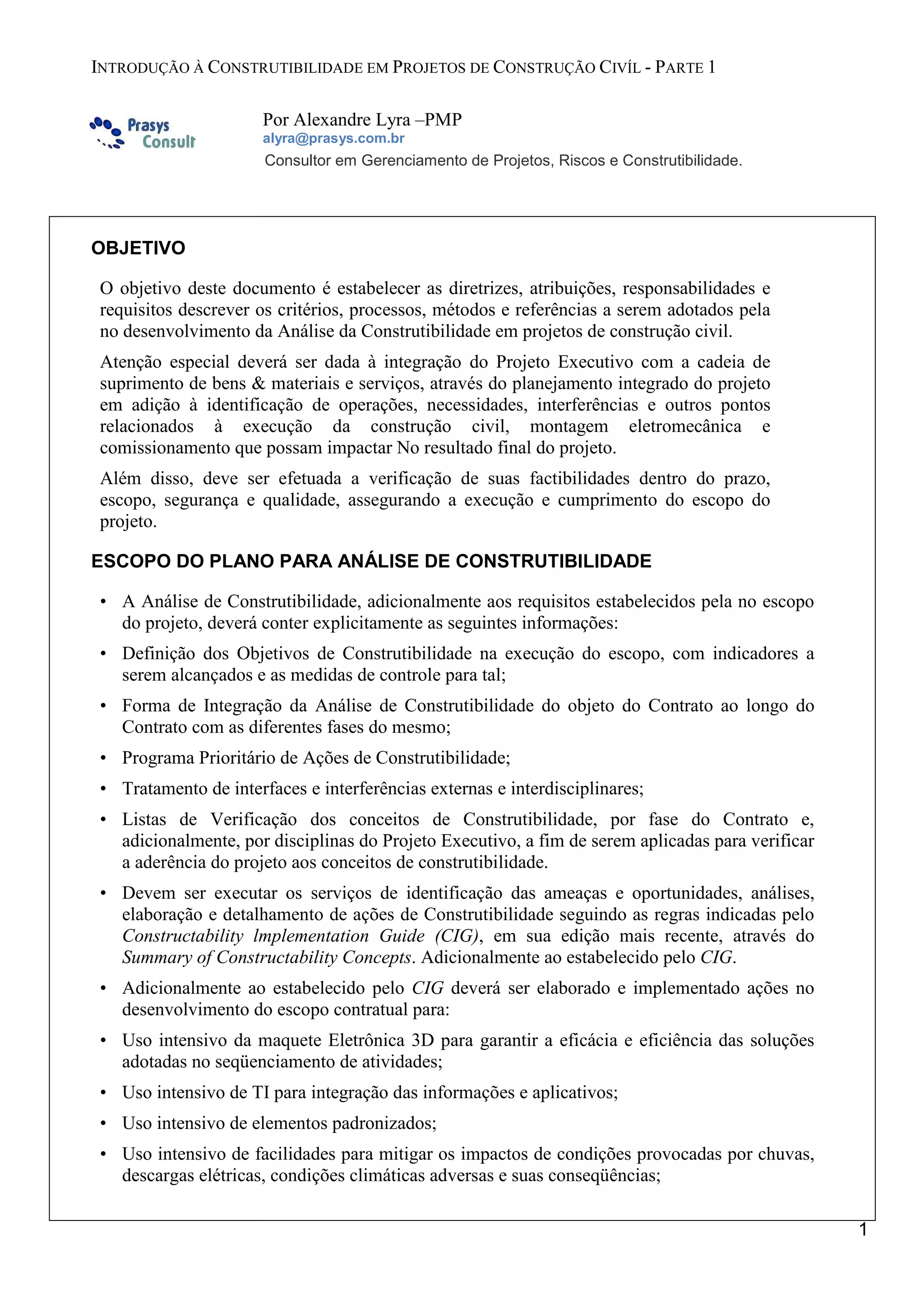 1) O documento introduz os conceitos e diretrizes para análise da construtibilidade em projetos de construção civil, com foco na integração entre projeto, suprimentos e execução.