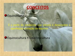 O documento fornece uma introdução à equinocultura, abordando os seguintes tópicos: conceitos básicos sobre equinos, histórico da domesticação dos cavalos, classificação zoológica e evolução zootécnica desde os ancestrais Hyracotherium até as raças atuais de Equus. Também descreve as principais características morfológicas e fisiológicas dos equinos.