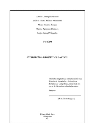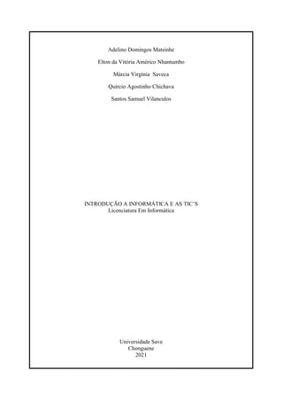 O documento apresenta uma introdução à informática e às tecnologias de informação e comunicação (TICs), abordando conceitos, definições e a evolução dos computadores ao longo da história. Ele também explora as áreas de aplicação da informática e das TICs, como robótica, telemática e automação. Com base em pesquisa bibliográfica e online, o trabalho visa fornecer uma compreensão básica dos temas abordados no curso de Licenciatura em Informática da Universidade Save Chonguene.