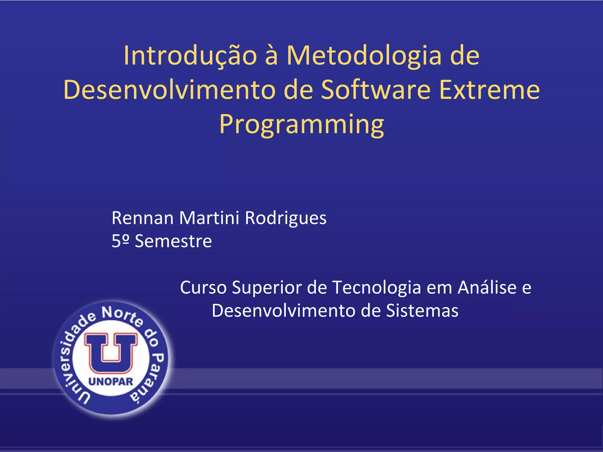 O documento apresenta uma introdução à metodologia de desenvolvimento de software Extreme Programming (XP), destacando a importância de metodologias ágeis e a evolução dos processos de desenvolvimento ao longo dos últimos 30 anos. A XP é caracterizada por valores como simplicidade, comunicação, feedback e coragem, visando a adaptação às mudanças e colaboração com o cliente, proporcionando entregas contínuas e de alto valor. Além disso, são descritas as práticas de planejamento, projeto, codificação e testes que garantem a qualidade e a eficiência no desenvolvimento de software.