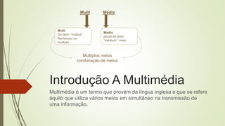 O documento introduz o conceito de multimédia, que envolve a combinação de diferentes meios de comunicação para transmitir informações, como texto, imagens, vídeos e som. Ele também aborda os conceitos de hipertexto e hipermédia, destacando a interatividade como um aspecto fundamental na experiência do usuário. Além disso, discute a interface como a forma de interação entre o usuário e os sistemas computacionais.