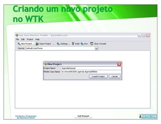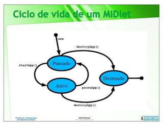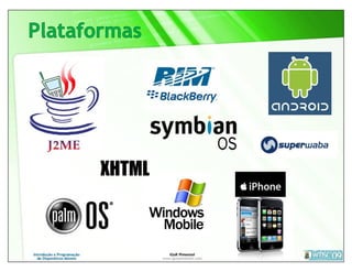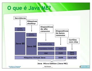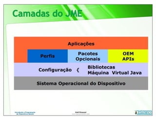 O documento apresenta informações sobre desenvolvimento para dispositivos móveis usando a plataforma Java ME. Apresenta as configurações CLDC e CDC, o perfil MIDP, componentes, ambientes de desenvolvimento e exemplo de código "Olá Mundo". Aborda também empacotamento, distribuição e emulação de aplicativos móveis Java.