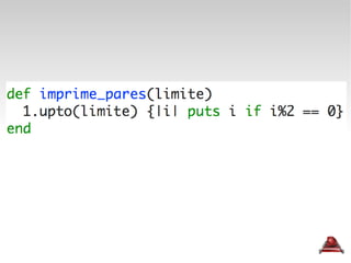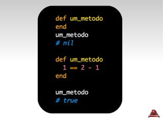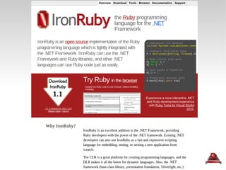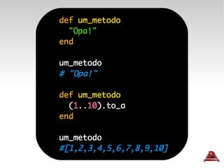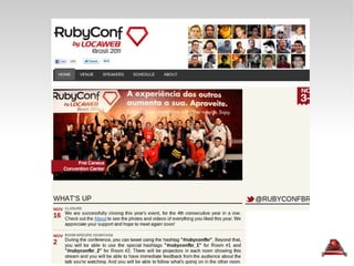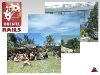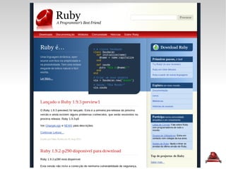 A apresentação introduz a linguagem Ruby e o framework Ruby on Rails. Ruby é uma linguagem de programação dinâmica, interpretada e open source que permite adicionar código e estender classes e objetos durante a execução. Rails é um framework web produtivo com curva de aprendizado pequena e boas práticas que roda em várias plataformas e é extraído de uma aplicação existente. A apresentação também fornece recursos para aprender Ruby on Rails, como guias, exemplos e ferramentas como Gems.