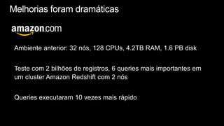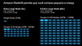 O documento apresenta o Amazon Redshift, um data warehouse na nuvem da AWS que oferece alta performance a um baixo custo, escalabilidade a petabytes e suporte a ferramentas de BI. Ele pode ser provisionado facilmente, paga apenas pelo uso e é cerca de 10 vezes mais barato que soluções tradicionais de data warehouse.