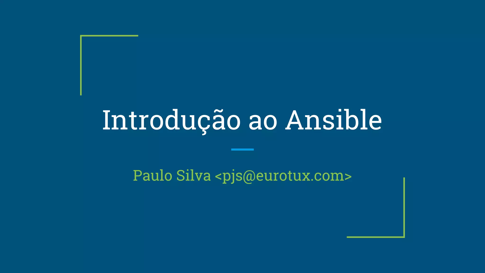 Ansible é uma ferramenta de automação open source que permite a gestão de configurações de servidores de forma agentless através de SSH. Utiliza playbooks escritos em YAML para executar tarefas sequencialmente nos servidores geridos, de forma idempotente. Os playbooks podem incluir variáveis, loops, condicionais e notificações entre tarefas.