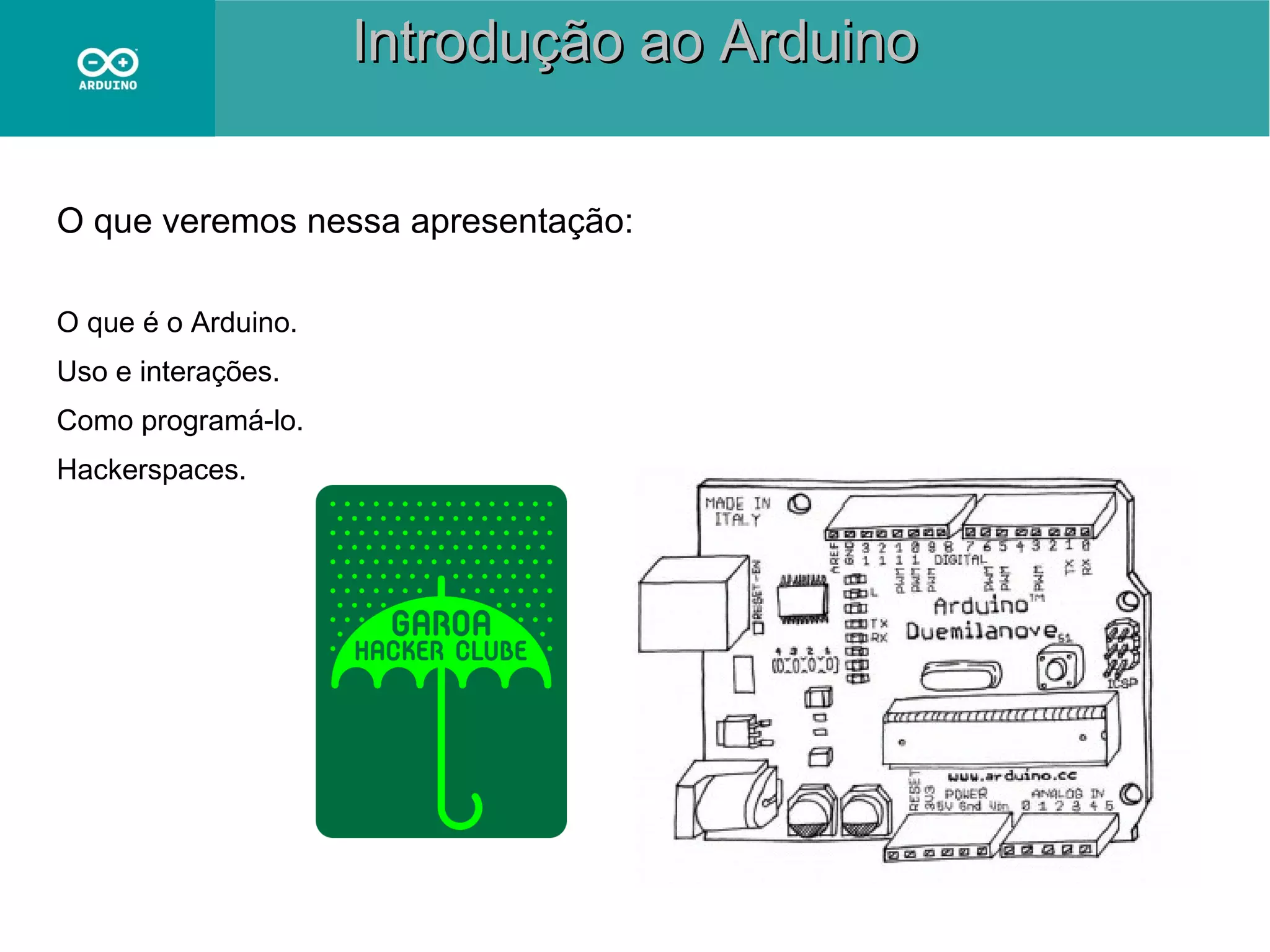 O documento introduz o Arduino, descrevendo seu hardware, software e aplicações. Explica como programá-lo usando a IDE Arduino e bibliotecas. Também apresenta hackerspaces como laboratórios comunitários para projetos eletrônicos e tecnológicos.
