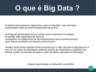A palestra apresenta uma visão geral sobre big data, destacando suas características principais, que incluem volume, velocidade, variedade, veracidade e valor. Enfatiza a importância da cultura organizacional na extração de informações e na criação de projetos valiosos, além de discutir o perfil do profissional de big data e suas habilidades necessárias. O documento também menciona o uso de métodos científicos para lidar com dados em diversas formas e origens, propondo uma análise que vai além do mero armazenamento e processamento.
