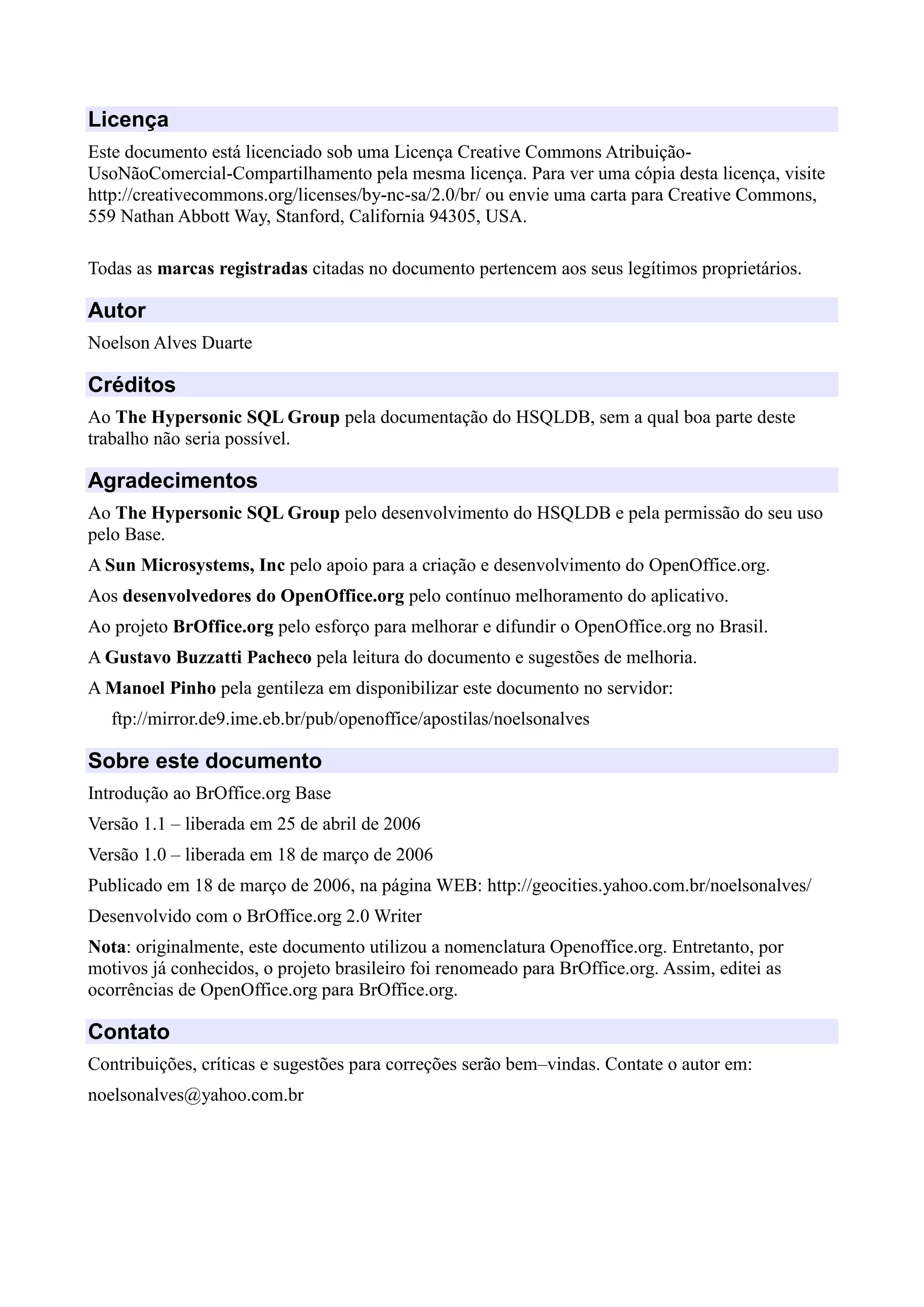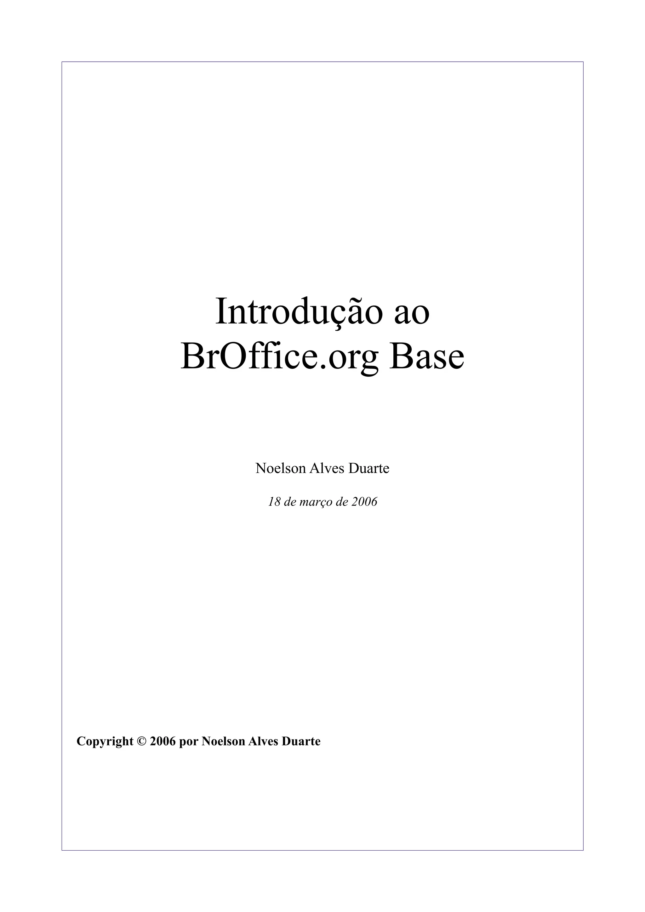 Este documento introduz o BrOffice.org Base e fornece instruções sobre como criar e gerenciar tabelas, formulários, consultas e relatórios em bancos de dados. Ele explica como definir estruturas de tabela, inserir e editar dados, criar consultas SQL e relatórios, e administrar o banco de dados.