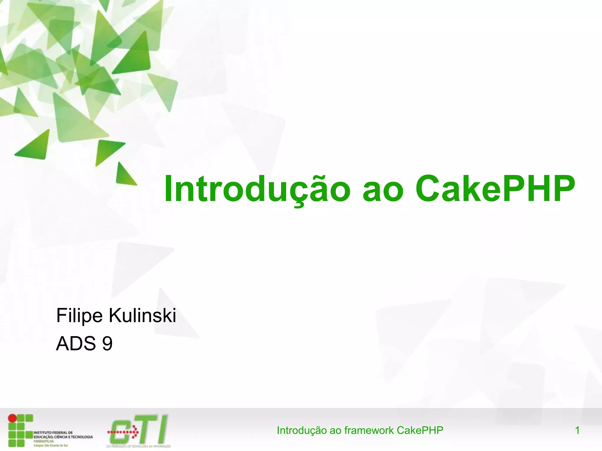 Este documento fornece uma introdução ao framework CakePHP, incluindo o que é PHP e framework, exemplos de frameworks, e os principais componentes do CakePHP como Model, View e Controller. Também discute os benefícios do CakePHP como comunidade ativa, compatibilidade com PHP, e arquitetura MVC.