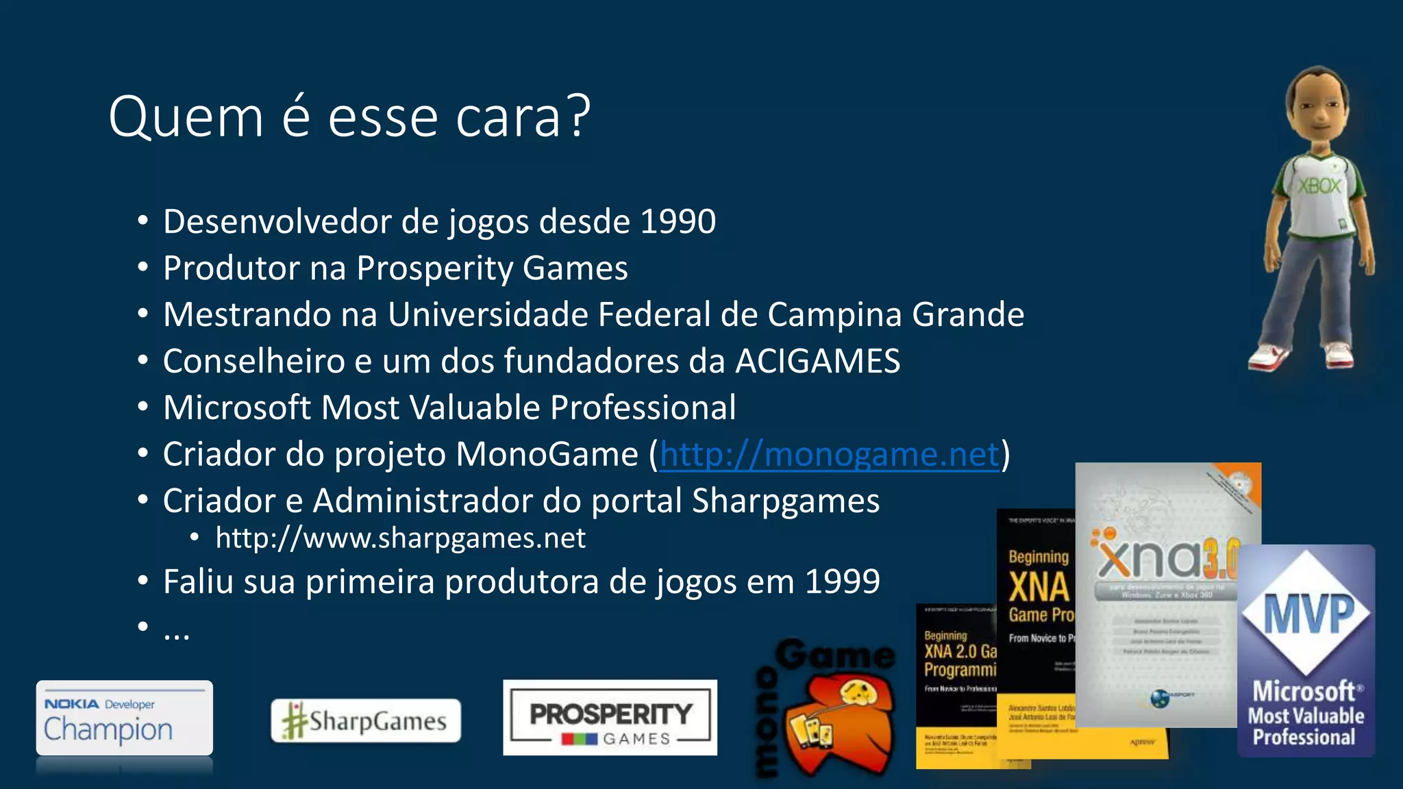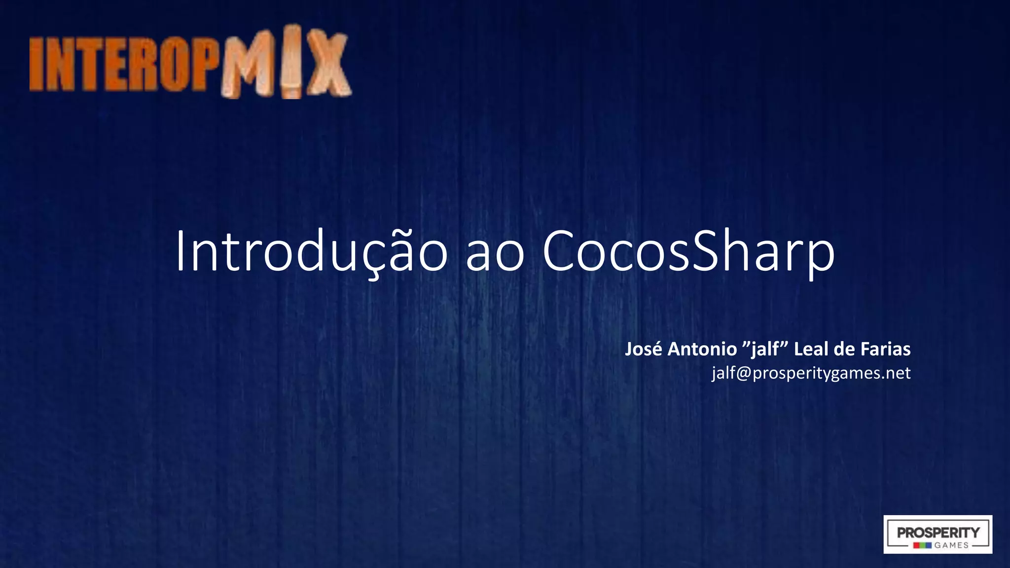 Este documento introduz o CocosSharp, uma biblioteca para desenvolvimento de jogos 2D multiplataforma usando C#. Ele descreve quem é o autor, o que é o CocosSharp, e fornece uma visão geral da API, incluindo cenas, sprites, ações, áudio, física e mais.
