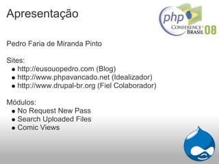 A apresentação introduz o sistema de gerenciamento de conteúdo Drupal, destacando que ele faz muito e requer programação mínima, possui uma grande quantidade de módulos e tem uma comunidade consolidada globalmente e no Brasil. O documento também discute as dificuldades iniciais de aprendizado com Drupal e demonstra os passos básicos de instalação e configuração.