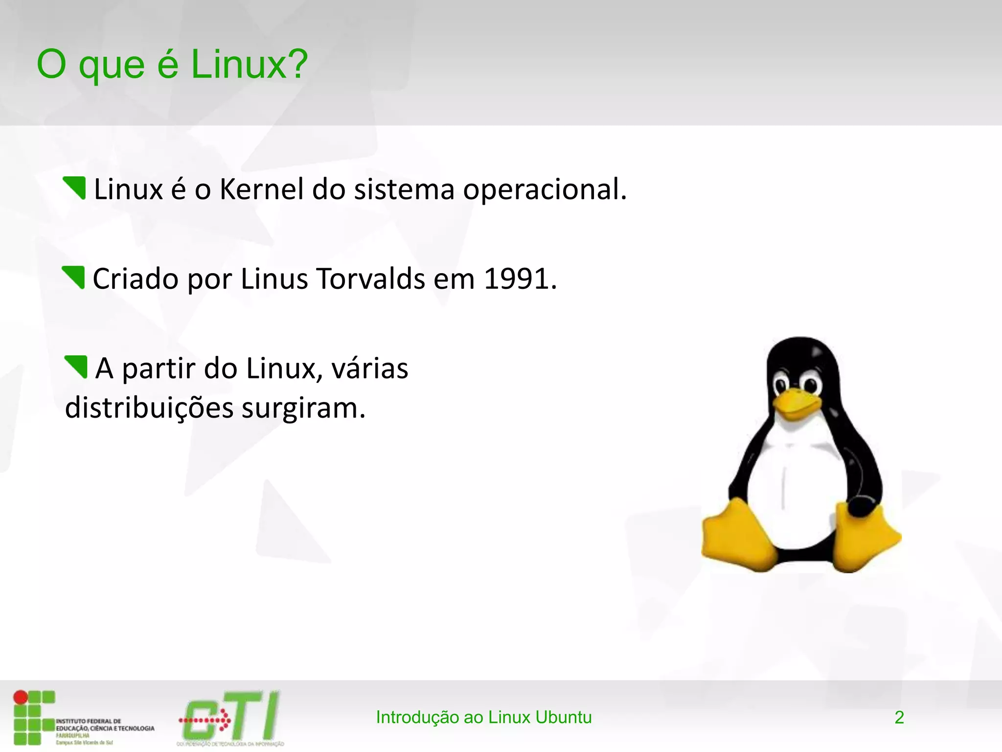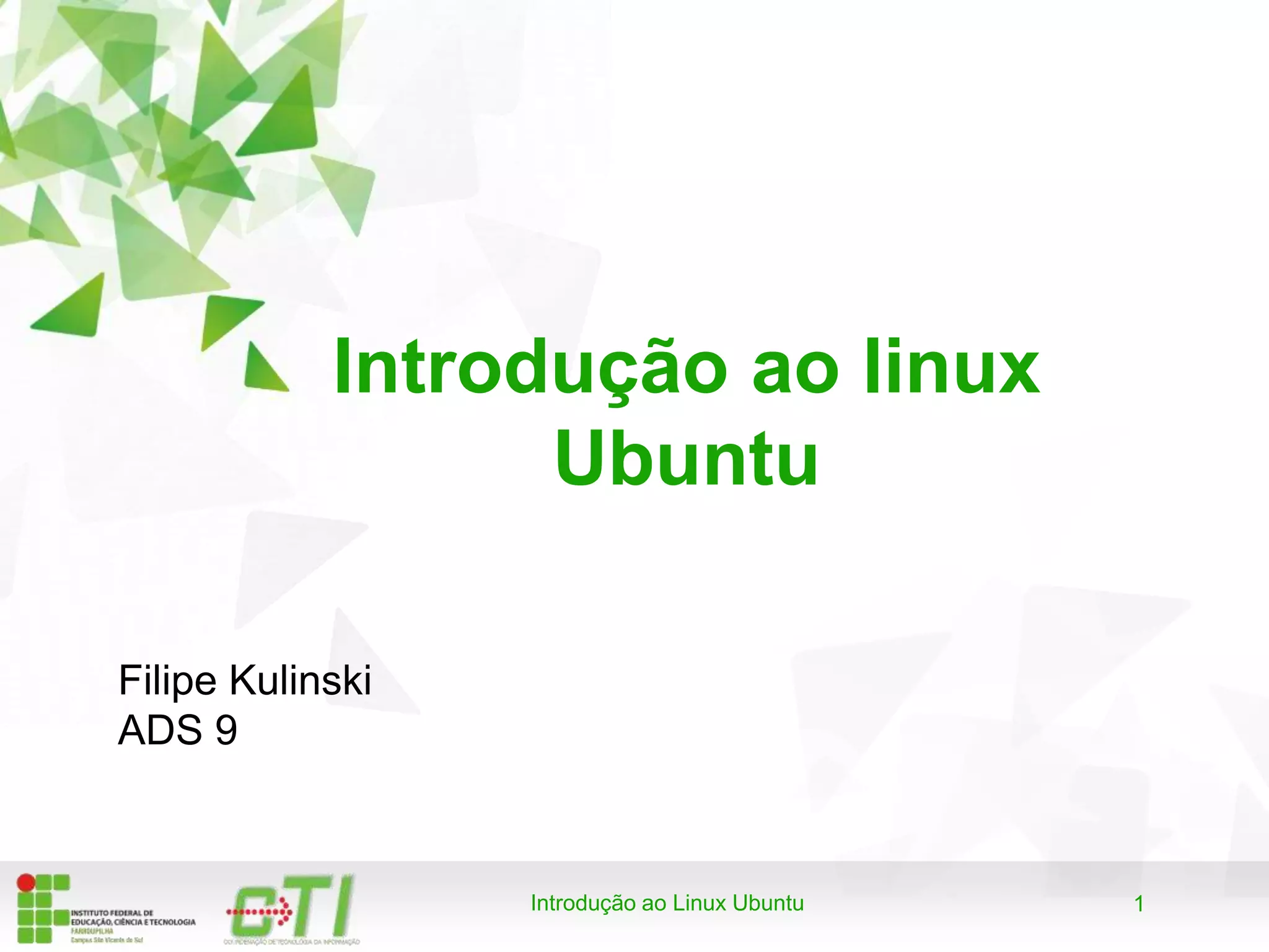 O documento fornece uma introdução ao sistema operacional Linux Ubuntu, explicando que o Ubuntu é uma distribuição Linux criada em 2004 e atualmente na versão 15.04, desenvolvida pela Canonical para notebooks, desktops e servidores. A interface do Ubuntu possui duas opções: CLI para comandos de texto e GUI para ícones e atalhos com mouse.
