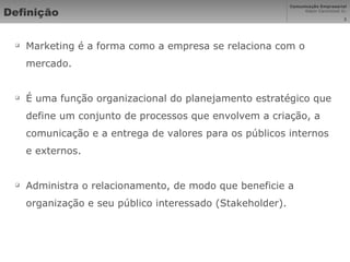 O documento apresenta uma introdução ao marketing, definindo-o como a forma como as empresas se relacionam com o mercado através de processos estratégicos de criação, comunicação e entrega de valor. Brevemente descreve a história do marketing desde a Revolução Industrial até os dias atuais, com foco no cliente e na integração dos meios de comunicação. Apresenta também os 4Ps do marketing mix e o conceito de Comunicação Integrada de Marketing.