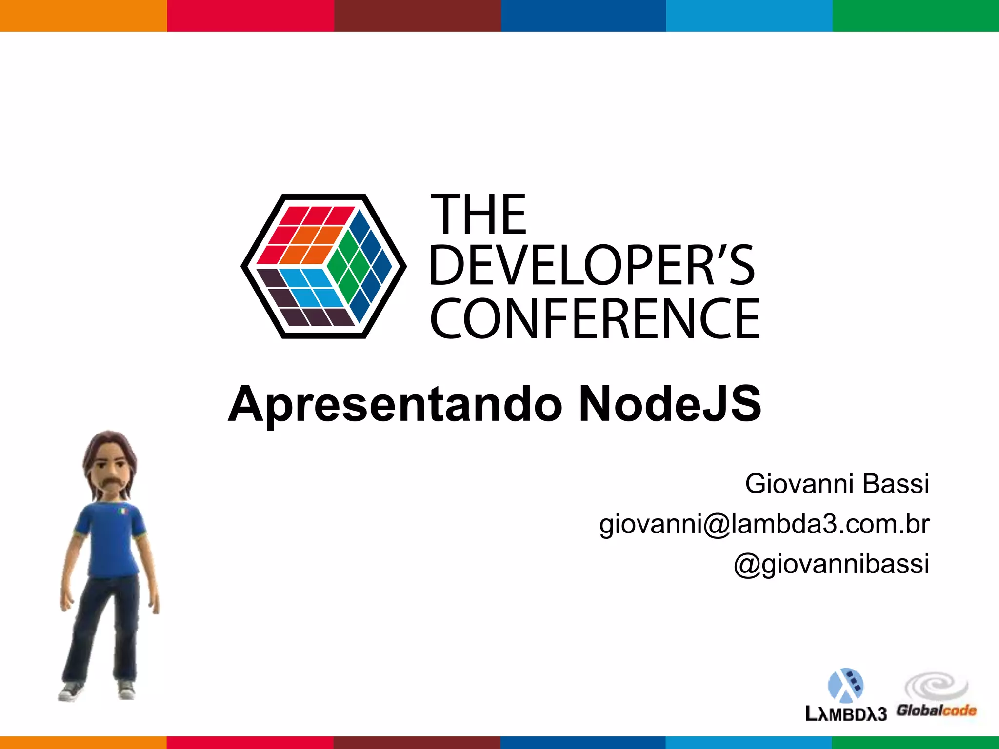 NodeJS é um ambiente de execução JavaScript que permite rodar código JavaScript fora de um navegador. Apresenta conceitos como módulos, pacotes, desenvolvimento assíncrono e ferramentas como NPM. Pode ser usado para construir servidores, aplicações desktop e ferramentas de desenvolvimento.