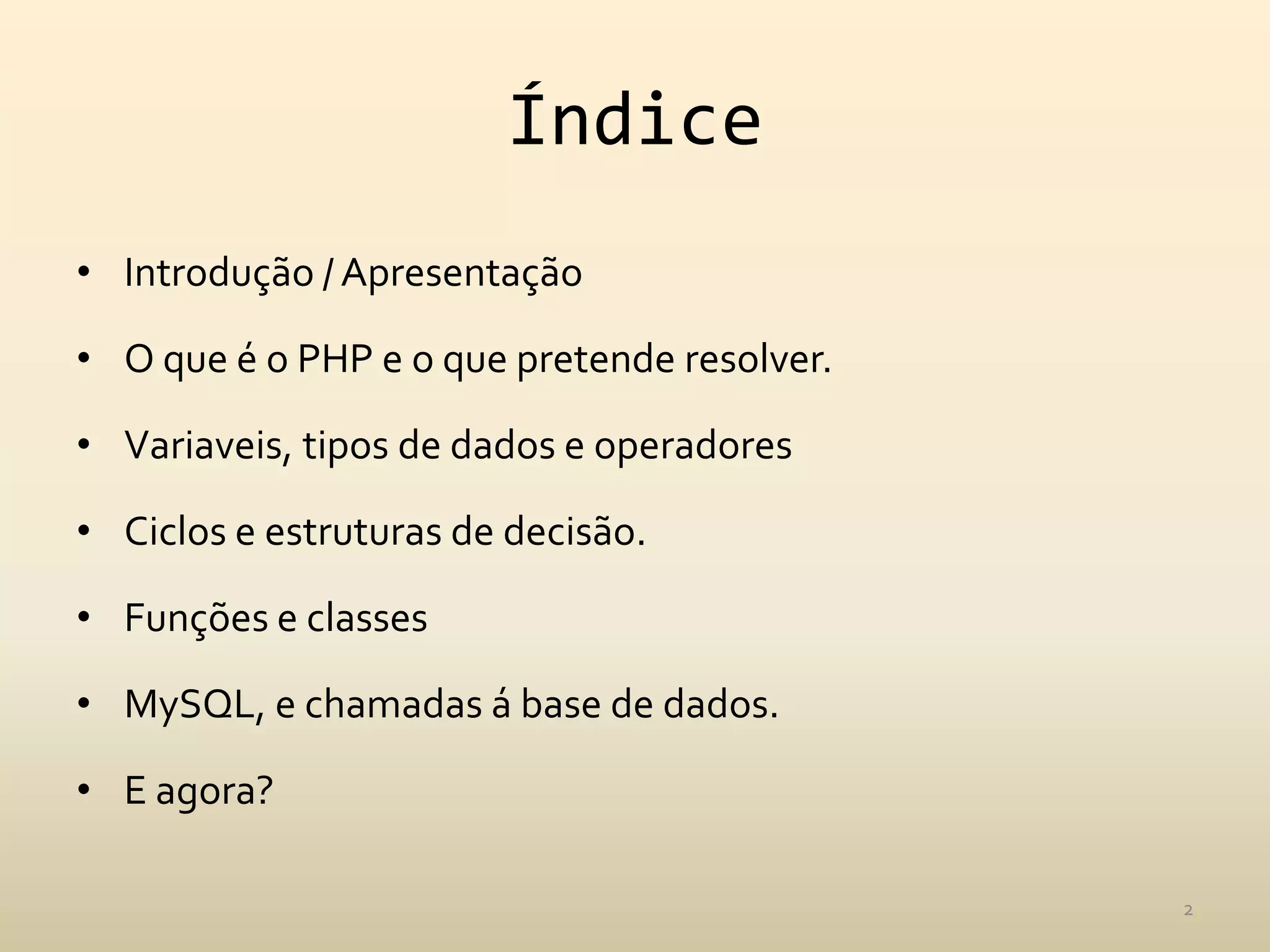 Este documento apresenta uma introdução ao PHP e MySQL em 3 frases. Apresenta o que é PHP e como funciona, variáveis, tipos de dados, operadores, ciclos, decisões, funções e classes. Explica como se conectar e manipular dados no MySQL e enfatiza a importância da prática.