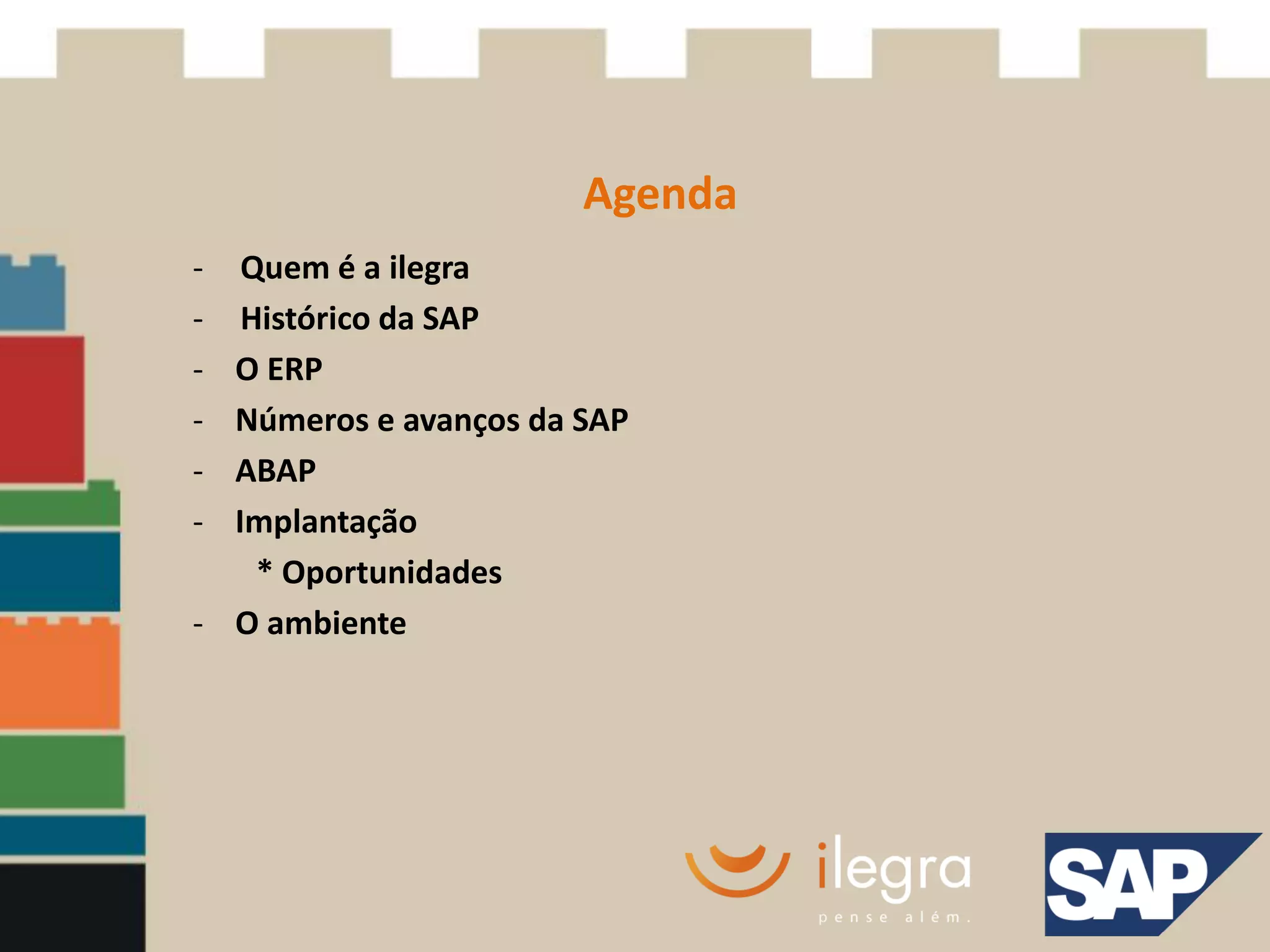 O documento aborda a história da SAP desde sua fundação em 1972, detalhando evolução de seus sistemas ERP como o ECC, suas vantagens e desvantagens. Destaca os módulos, números de clientes e avanços recentes da SAP, além de discutir a complexidade da implantação e as oportunidades de consultoria. Enfatiza a adaptabilidade do ERP à diversidade de negócios e a importância do treinamento e capacitação na implementação.