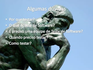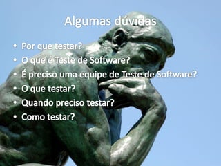 Este documento apresenta uma introdução ao teste de software, abordando os principais conceitos e atividades envolvidas no processo de teste de software, como planejamento, execução e avaliação dos resultados.