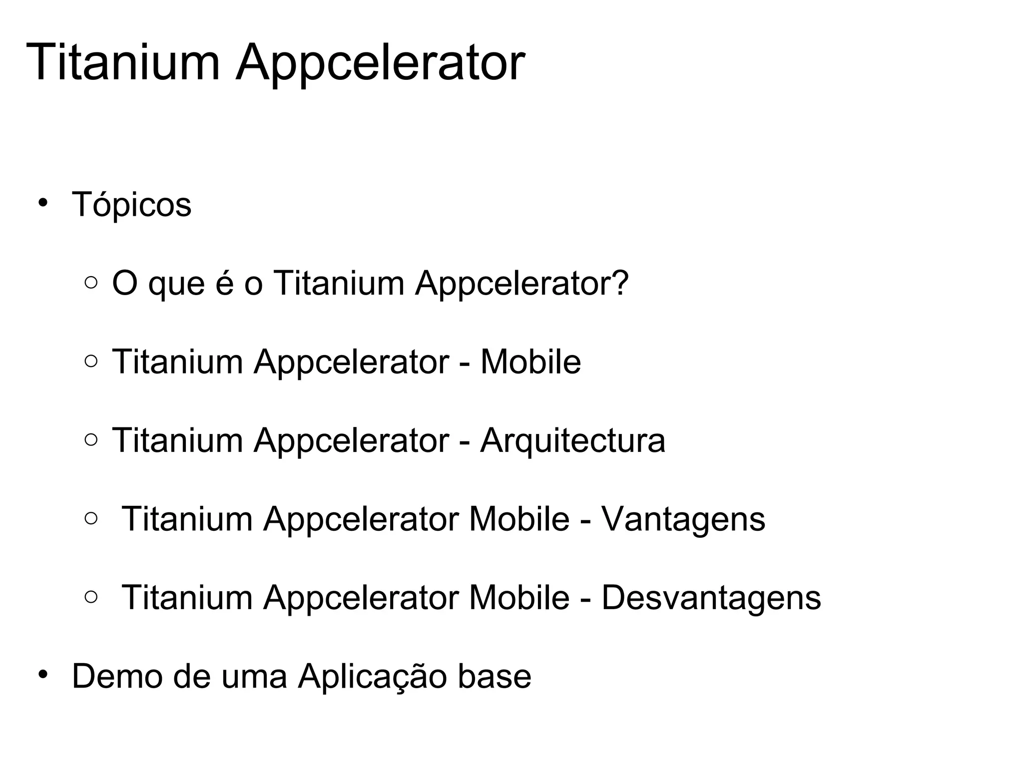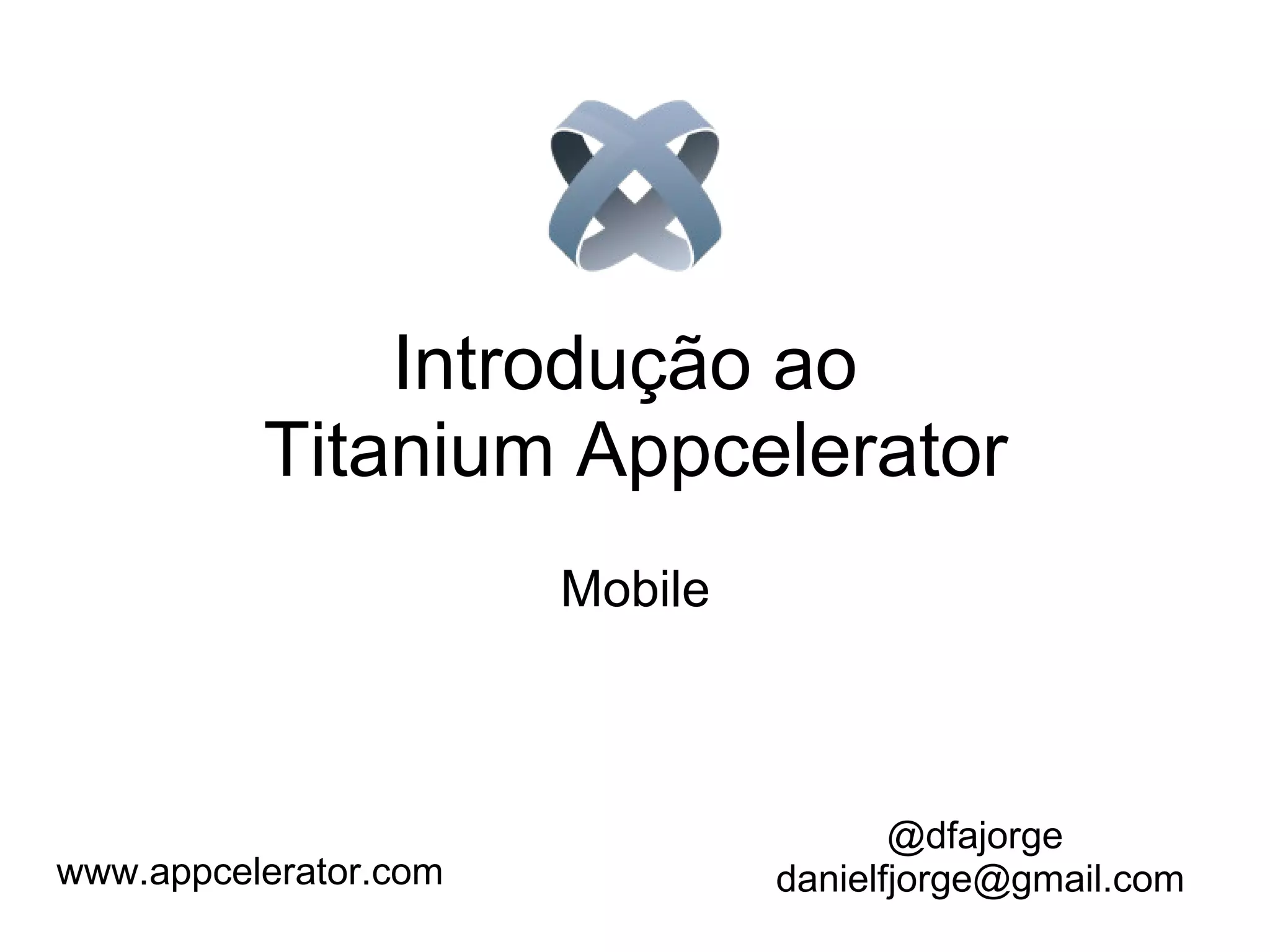 Titanium Appcelerator é um framework open source para desenvolvimento de aplicações mobile multiplataforma usando JavaScript. Ele permite acesso nativo às funcionalidades dos dispositivos móveis enquanto reutiliza código entre plataformas diferentes como Android, iOS e BlackBerry. O framework tem vantagens como reuso de código, tempo de produção reduzido e uso de tecnologias web, porém também possui algumas limitações e problemas eventuais.
