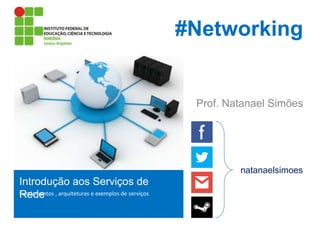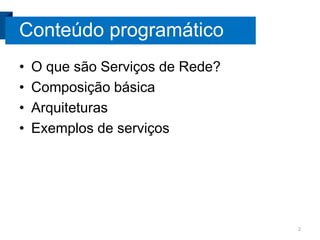 O documento apresenta uma introdução aos serviços de rede, definindo o que são, suas composições básicas, arquiteturas e exemplos. É descrito que serviços de rede são compostos por servidores, clientes, protocolos e middleware, e que as arquiteturas podem ser de duas camadas, três camadas ou ponto a ponto. Exemplos como HTTP, FTP, DHCP e DNS são apresentados.