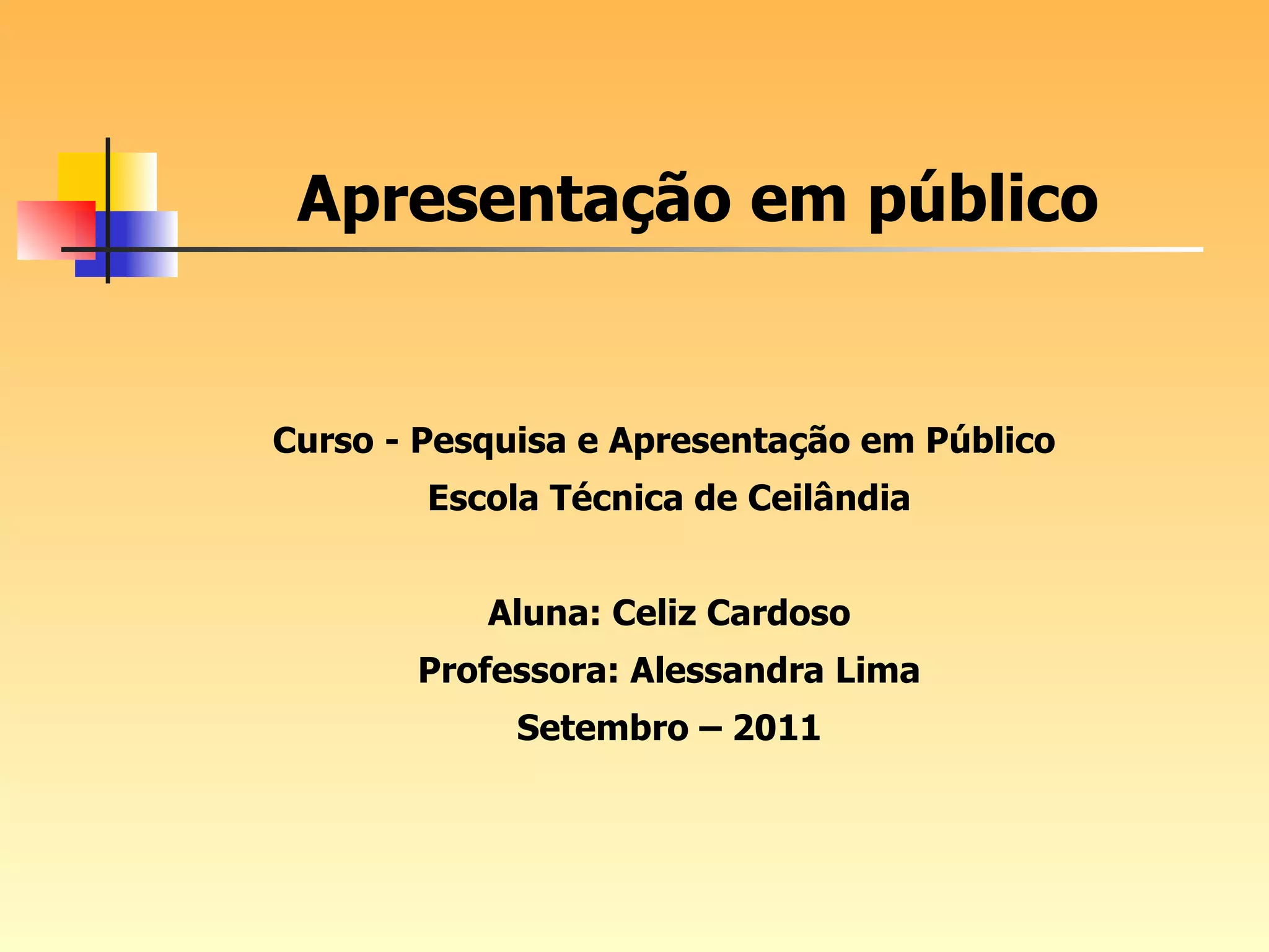 Curso - Pesquisae Apresentação em Público Escola Técnica de Ceilândia Aluna: Celiz Cardoso Professora: Alessandra Lima Setembro – 2011 Apresentação em público