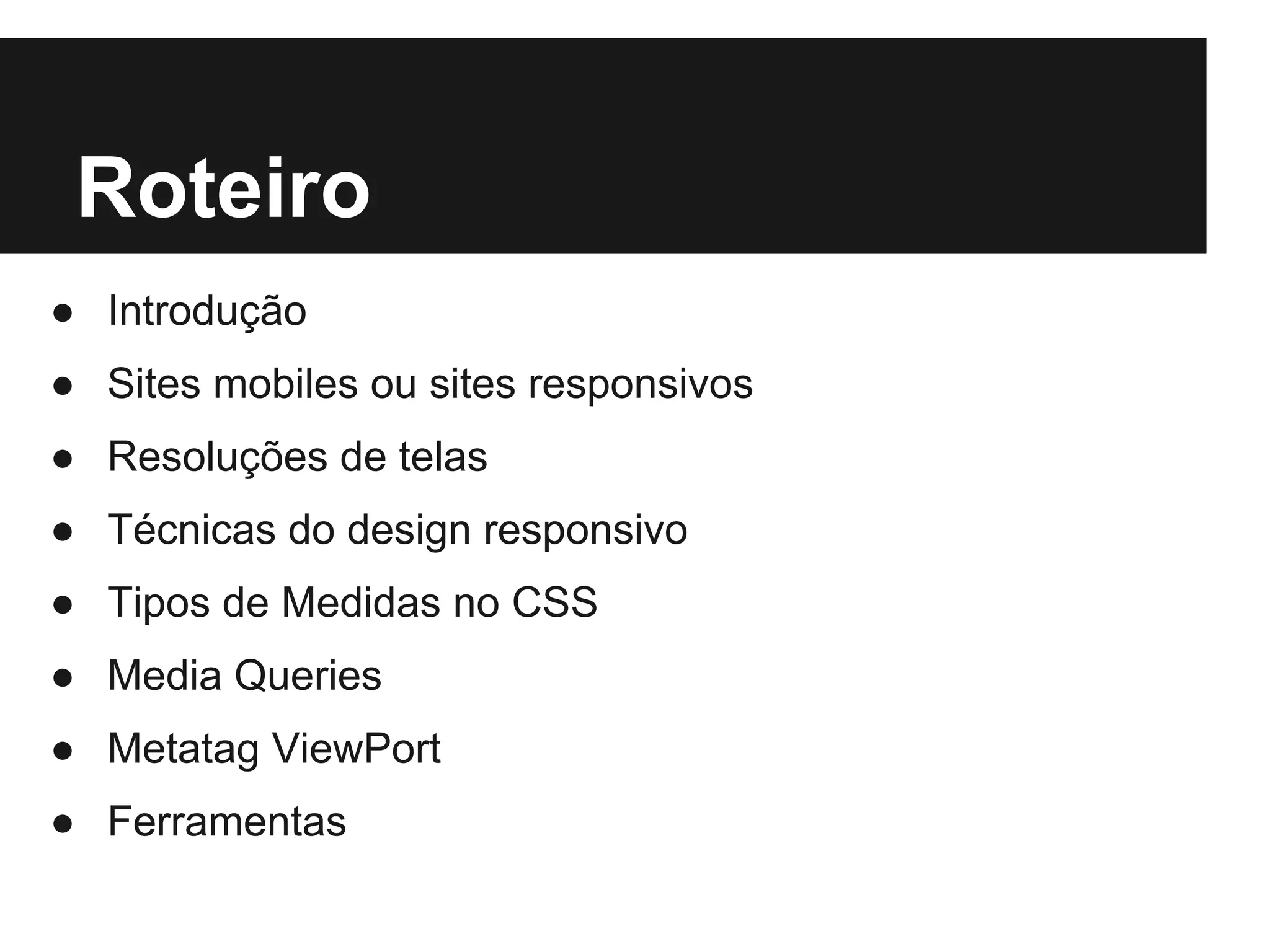 O documento introduz os conceitos e técnicas de design responsivo para desenvolvimento web. Apresenta a história do design responsivo, as resoluções de tela, técnicas como layout fluido, recursos flexíveis e media queries, além de ferramentas para teste e validação de sites responsivos.