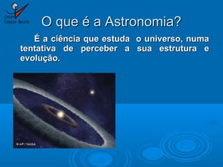 O documento fornece uma introdução básica à astronomia, explicando o que é a astronomia, sua história, os principais objetos celestes como estrelas, galáxias, o sistema solar e conceitos como ano-luz. É destacado que a astronomia é a ciência mais antiga e que instrumentos como o telescópio revolucionaram as observações astronômicas.