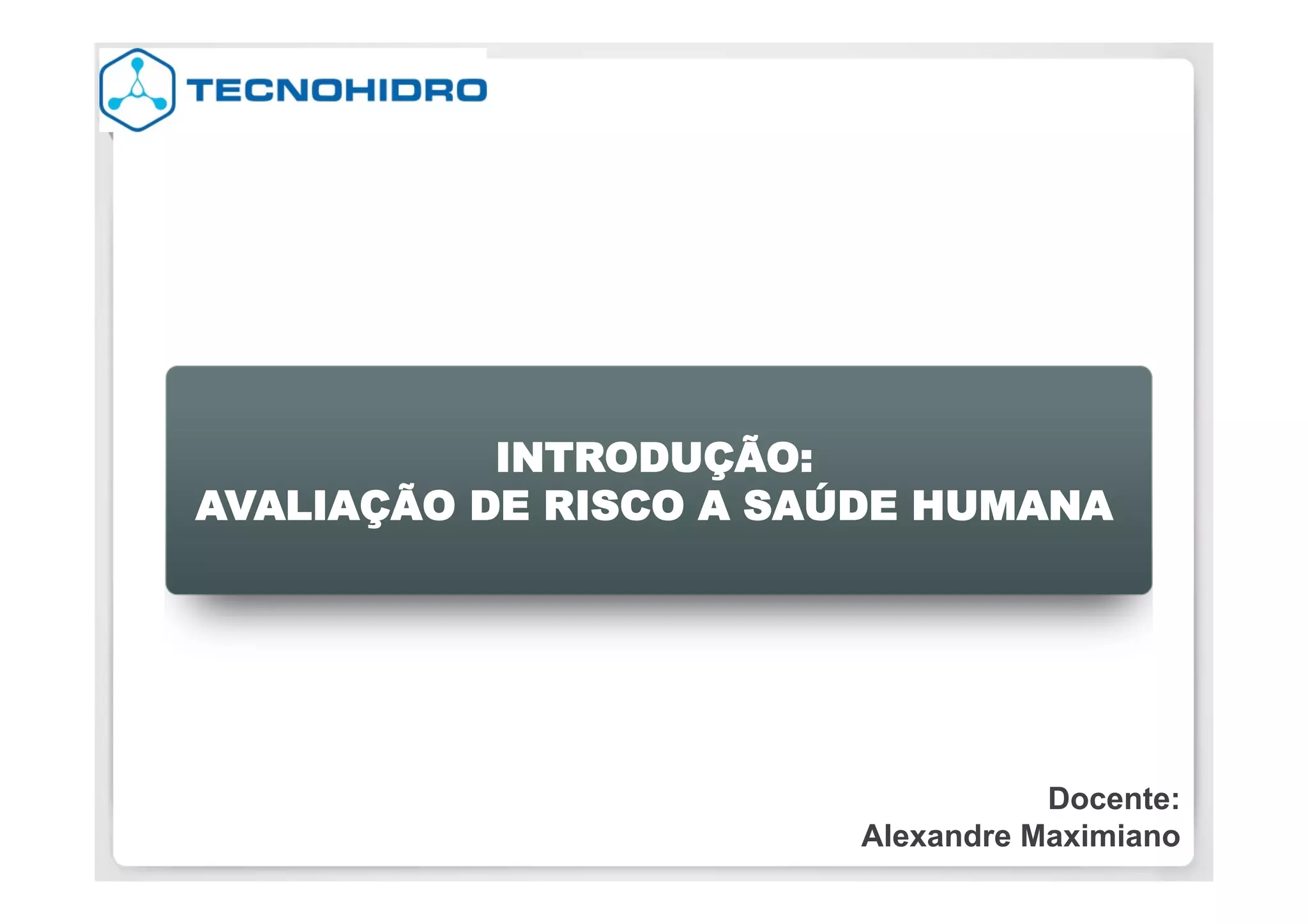 O documento discute a avaliação de risco à saúde humana em áreas contaminadas. Aborda conceitos básicos de avaliação de risco, modelos conceituais de exposição, coleta e análise de dados, avaliação e quantificação de risco. Também apresenta breve histórico da evolução do gerenciamento de áreas contaminadas no Brasil e tendências atuais como comunicação de risco e gestão financeira baseada em risco.