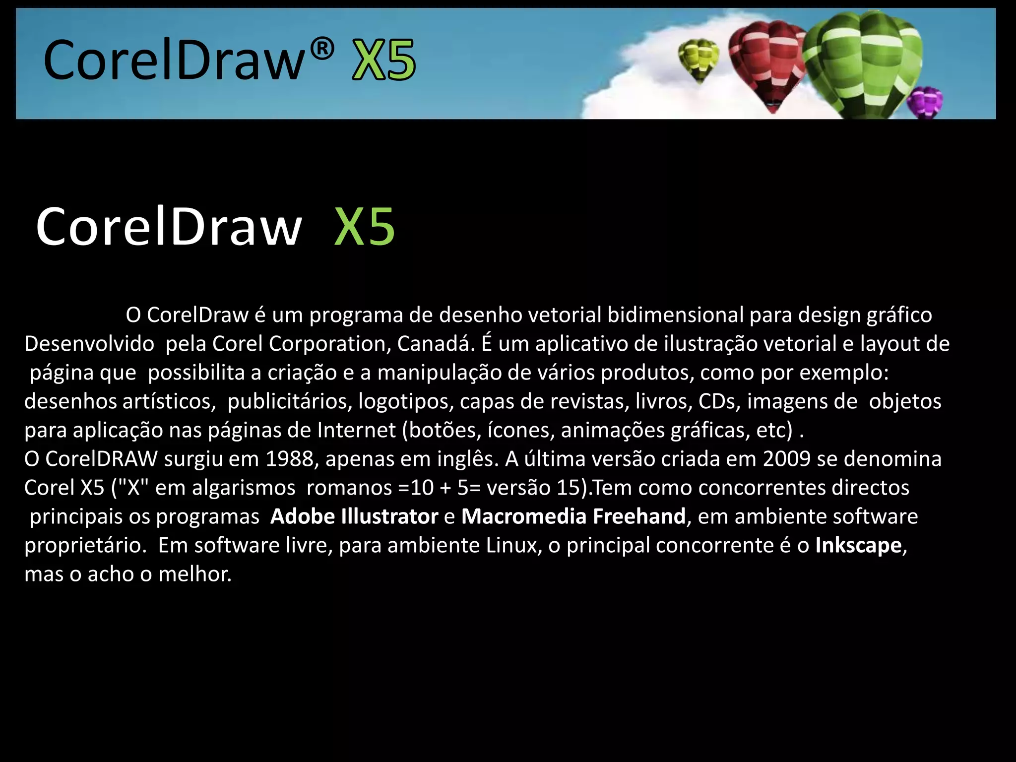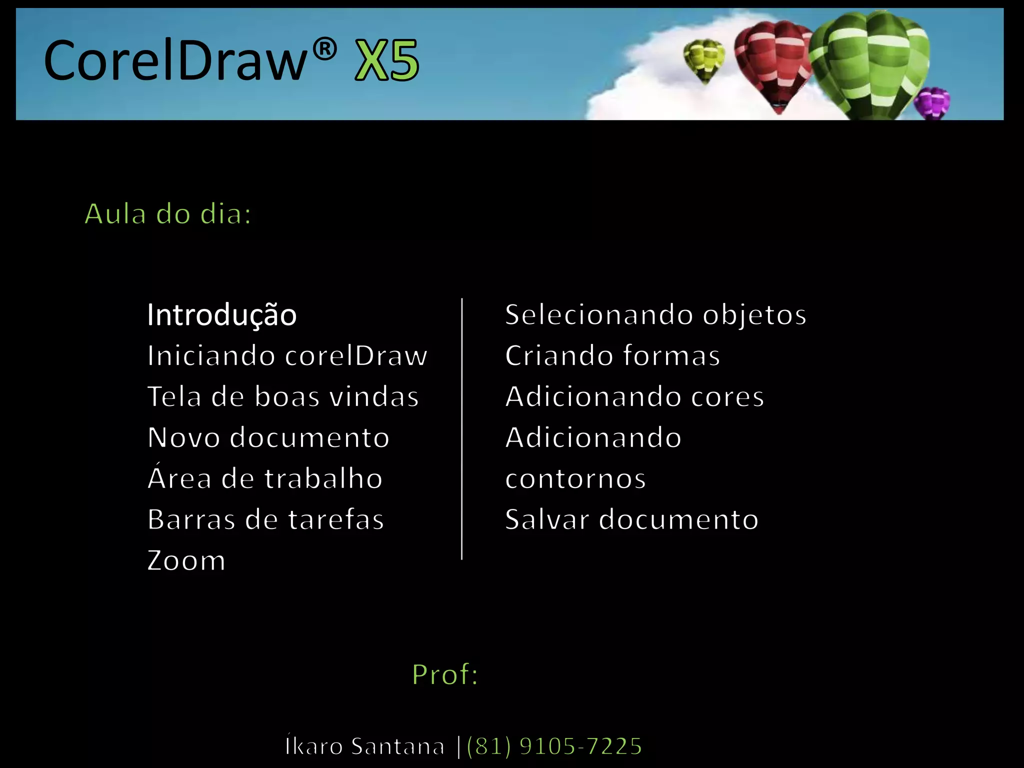 O documento apresenta uma aula introdutória sobre o software CorelDraw X5, incluindo como iniciar um novo documento, utilizar as ferramentas da interface e criar formas e objetos gráficos. É um programa de design gráfico vetorial usado para criação de ilustrações, logotipos e layouts.