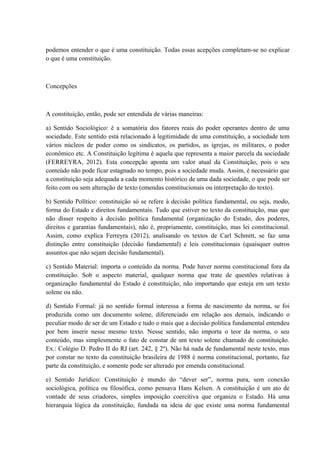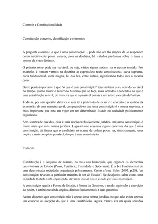 O documento discute o conceito de constituição, classificando-a como a norma suprema de um Estado que organiza seus elementos constitutivos e estabelece direitos fundamentais. Apresenta diferentes concepções de constituição (sociológica, política, material, formal e jurídica) e formas de classificá-la segundo origem, forma, extensão e conteúdo. Explora também os elementos essenciais e a evolução do constitucionalismo ao longo da história.