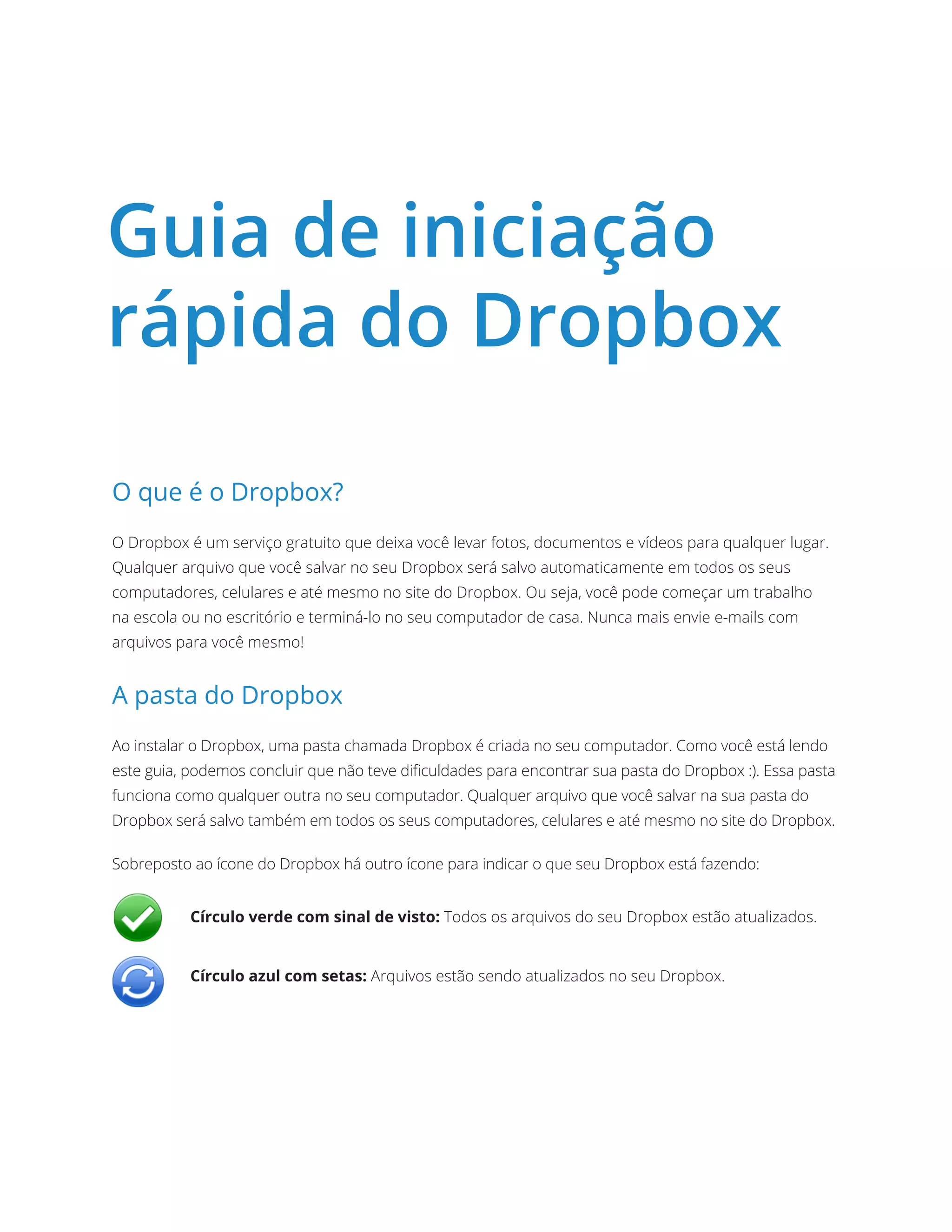 O documento fornece um guia rápido sobre o que é o Dropbox e como usá-lo. O Dropbox permite que os usuários armazenem e acessem arquivos de qualquer dispositivo, oferecendo sincronização automática entre computadores, celulares e o site do Dropbox. Os arquivos são armazenados na pasta Dropbox do computador e podem ser compartilhados com outros por meio de links.