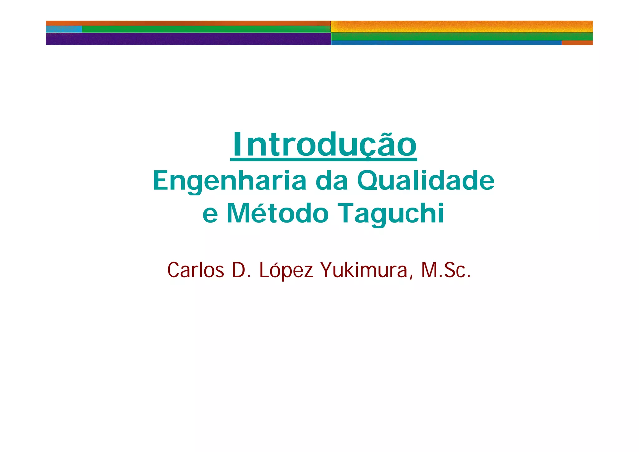 O documento discute engenharia da qualidade e o método Taguchi, abordando conceitos como: variabilidade, qualidade no projeto, capacidade de processos, projeto robusto e uso do MiniTab para análise. Apresenta ainda introdução sobre estatística, probabilidade e distribuição normal.