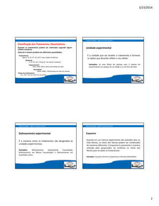 Este documento fornece uma introdução aos conceitos básicos da experimentação em produção animal, incluindo definições de tratamento, unidade experimental, delineamento experimental, variável resposta e fontes de variação. Também descreve os três princípios básicos da experimentação: repetição, casualização e controle local.
