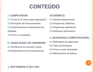 [1] O documento introduz conceitos básicos de informática, abordando tópicos como computador, hardware, software e segurança computacional. [2] É dividido em quatro seções principais, começando pela definição de computador e como ele é organizado, seguido pelo uso de hardware, softwares e, por fim, segurança computacional. [3] O documento serve como uma introdução geral aos principais componentes e aplicações da informática.
