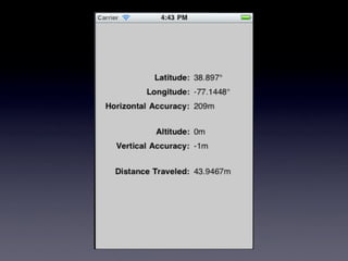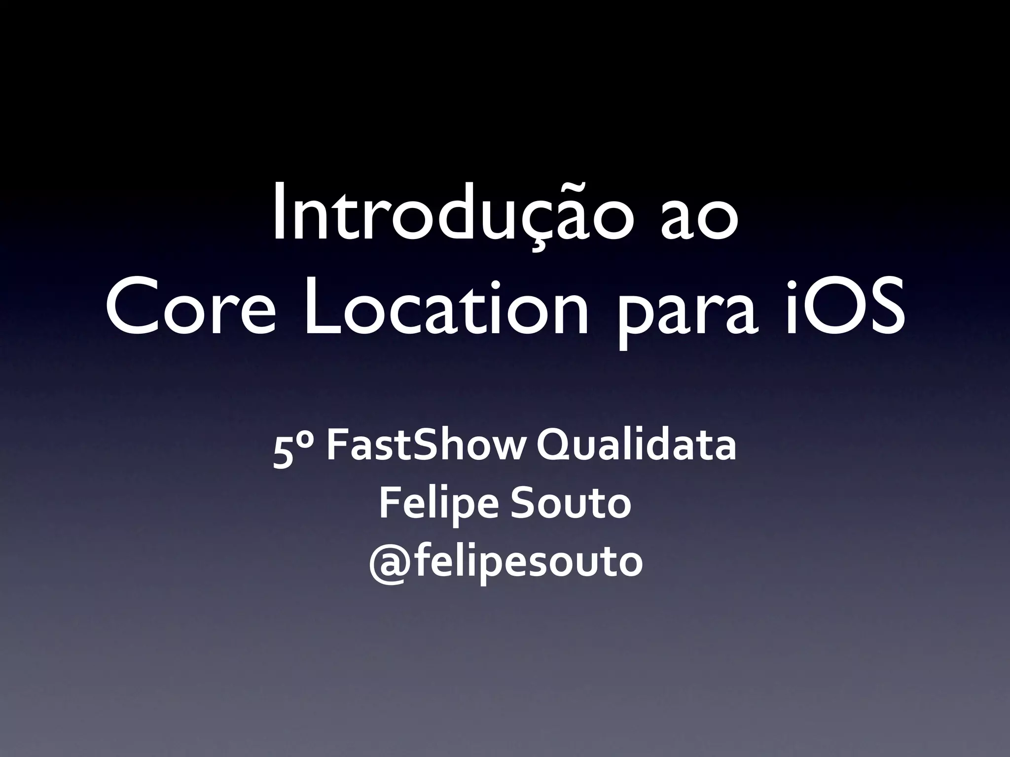 O documento introduz o framework Core Location do iOS, que fornece APIs para obter dados de localização do usuário, como latitude, longitude e altitude. Ele explica como o Core Location obtém a localização através de triangulação de torres celulares, Wi-Fi e GPS, e descreve as classes e métodos principais como CLLocation, CLLocationManager e CLLocationManagerDelegate.