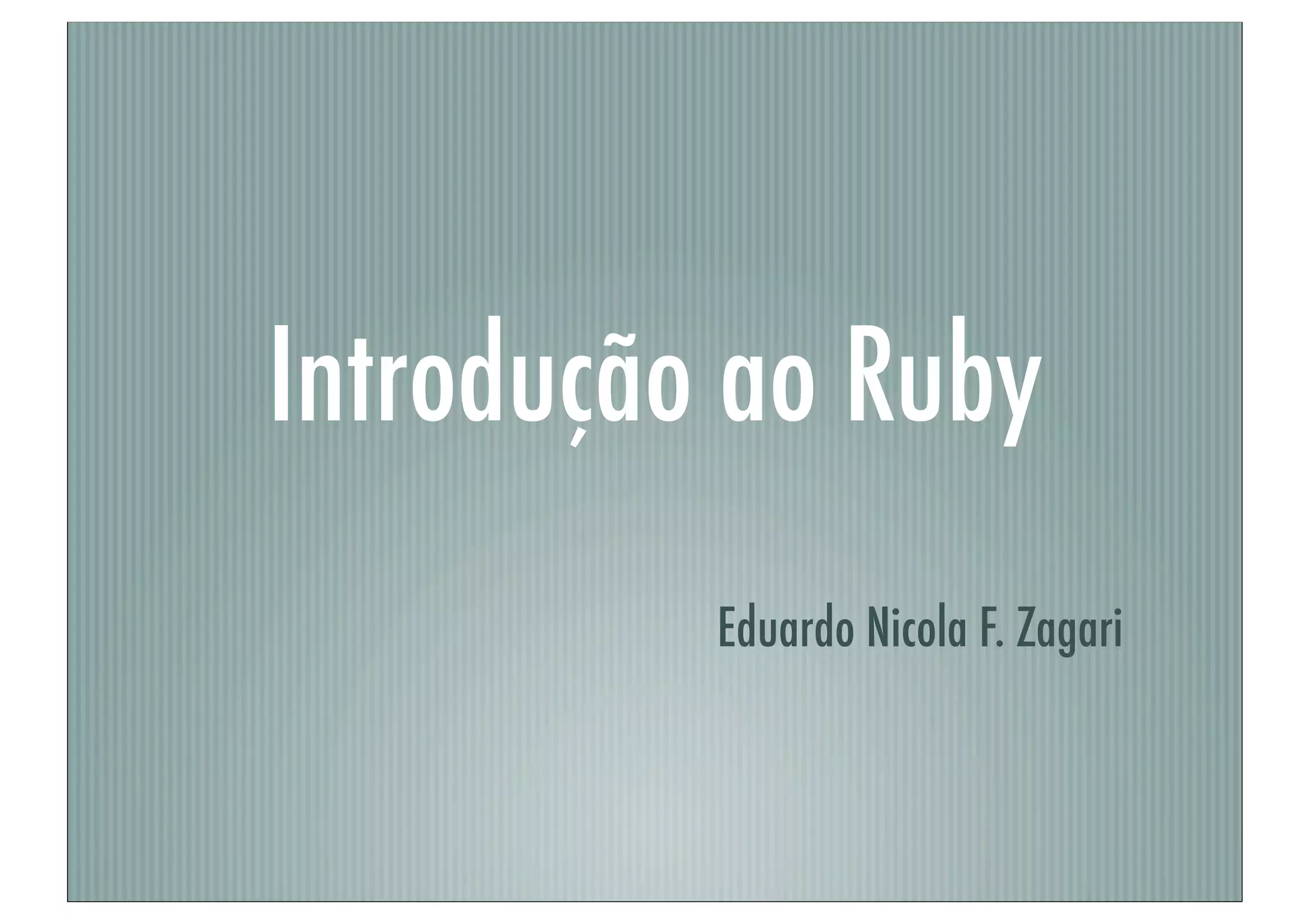 O documento é uma introdução ao Ruby, abordando instalação, tipos de dados básicos, variáveis, controle de fluxo, e como criar e utilizar métodos e blocos de código. Também discute conceitos como tipagem, procs, e operações com arrays. Inclui exemplos práticos de código para ilustrar as funcionalidades e recursos da linguagem.