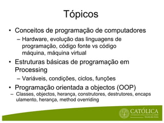 3) Programação orientada a objetos em Processing, incluindo classes, objetos, herança e encapsulamento.