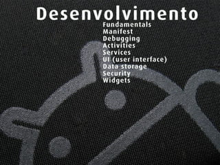 O documento introduz o sistema operacional Android, discutindo sua história, desenvolvimento, ambientes de programação e testes de aplicativos. É apresentada a estrutura básica de aplicativos Android, incluindo atividades, serviços e armazenamento de dados.