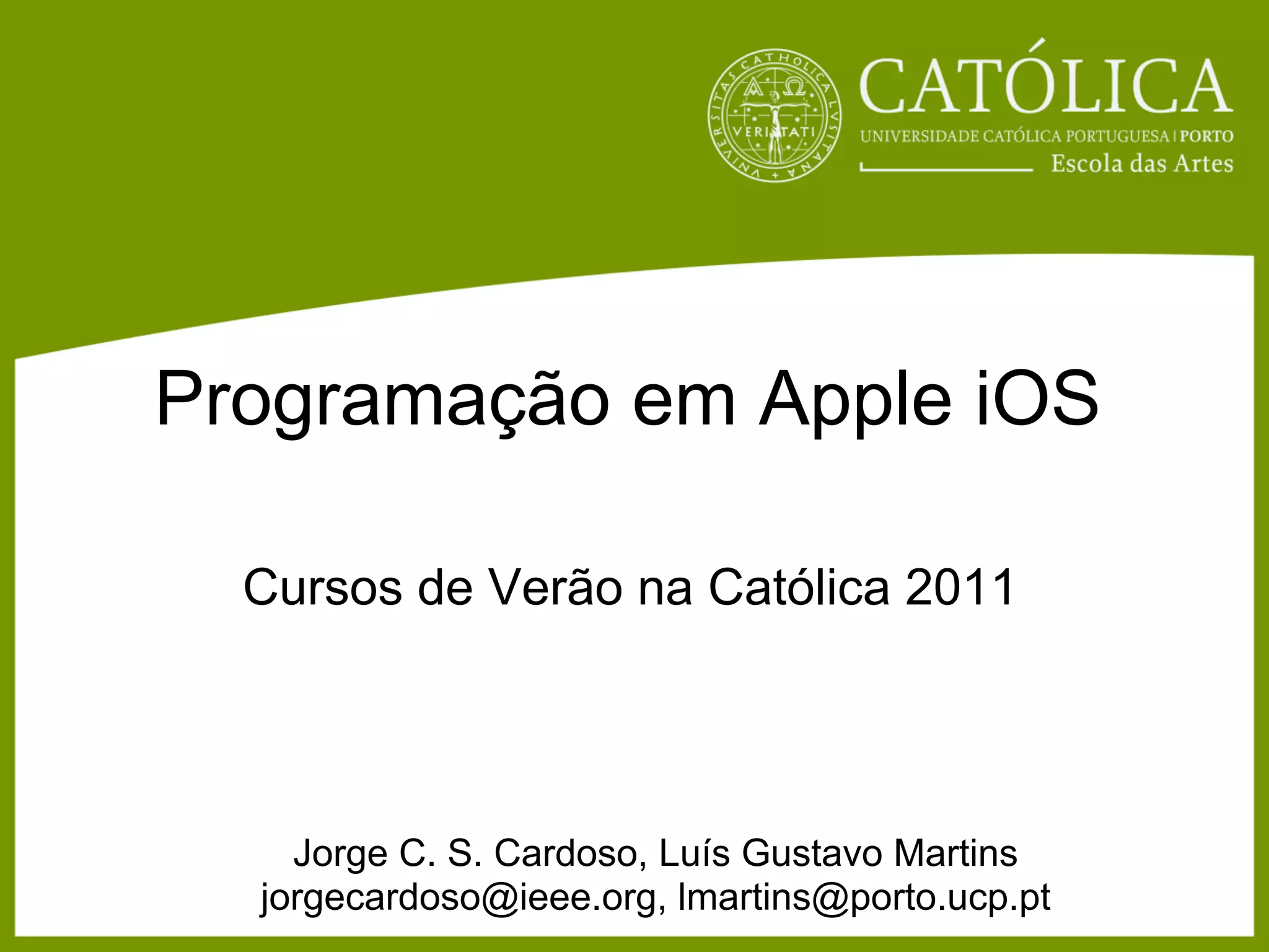 O documento discute o desenvolvimento de aplicações para dispositivos iOS usando o SDK da Apple. Ele descreve as ferramentas incluídas no SDK como o Xcode, Interface Builder e simulador, além das APIs Cocoa e Cocoa Touch. Também aborda tópicos como Model-View-Controller, delegação e um exemplo simples de calculadora de frações.