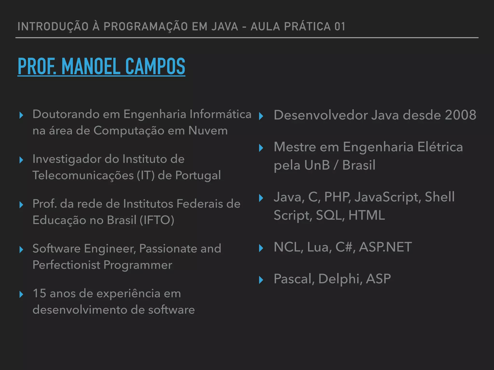 O documento apresenta uma aula prática de introdução à programação em Java ministrada pelo professor Manoel Campos. A agenda inclui a instalação do JDK em diferentes sistemas operacionais, a criação de programas Java utilizando editores de texto, a compilação e execução de códigos. O professor também fornece recomendações de vídeo-aulas online para aprendizagem do tema.