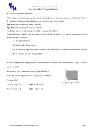 1) Uma empresa de calçado produz dois tipos de botas e precisa decidir a quantidade de cada tipo a ser produzida semanalmente para obter o máximo rendimento, considerando restrições de tempo de produção e controle de qualidade.