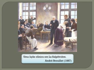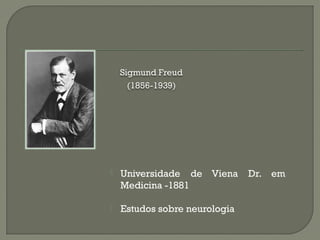 O documento resume a vida e obra de Sigmund Freud, incluindo sua formação acadêmica em medicina, estudos sobre neurologia e tratamento de histeria com hipnose. Aborda também o método catártico, livre associação, teoria da sedução infantil e estágios de desenvolvimento psicossexual.