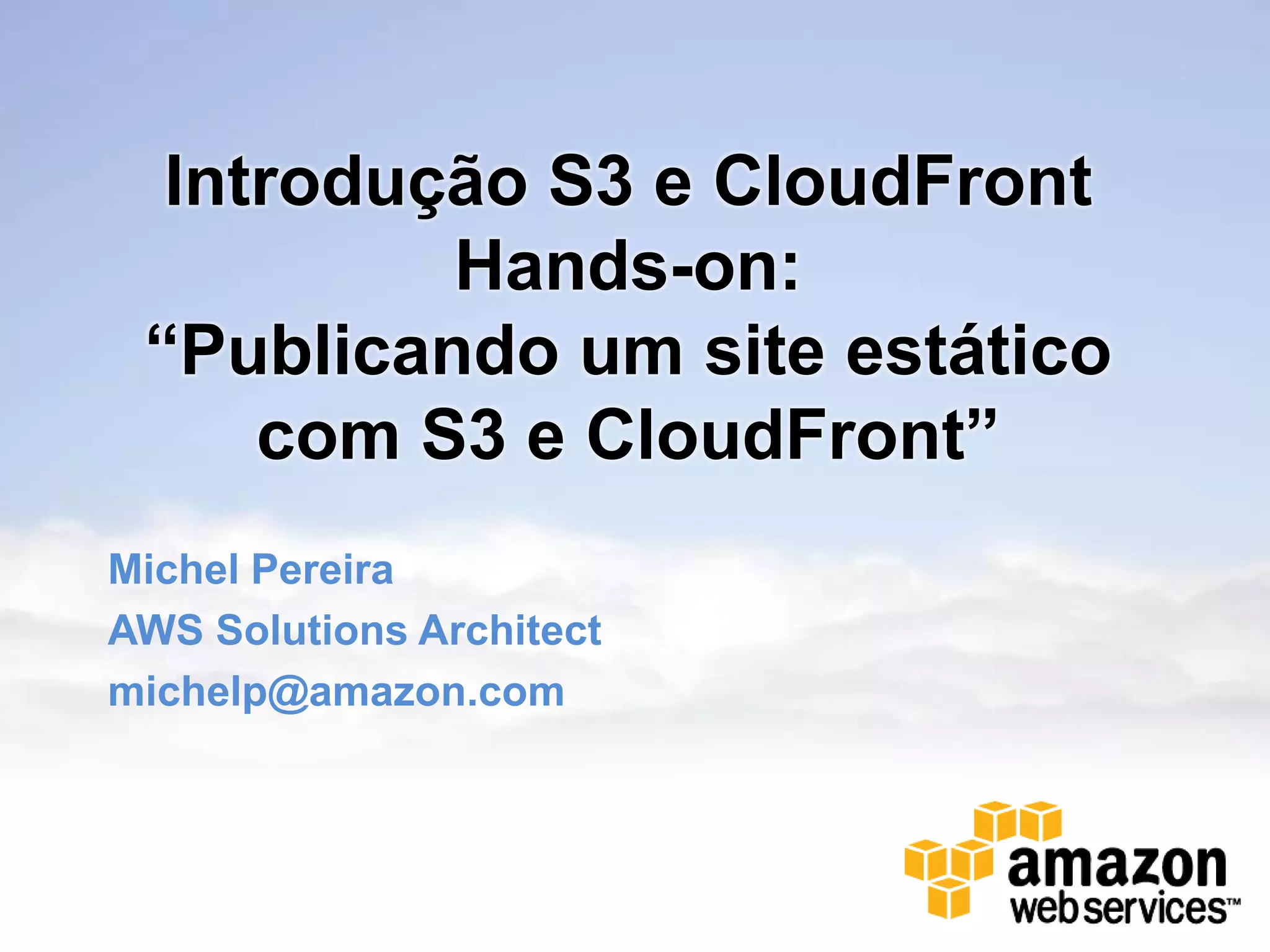 Este documento apresenta uma sessão sobre Amazon S3 e CloudFront. A sessão inclui uma introdução aos serviços S3 e CloudFront, como criar buckets e distribuições, e como publicar um site estático usando S3 e CloudFront. A agenda também inclui uma seção sobre regiões da AWS.