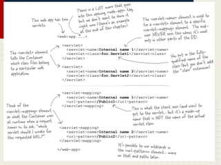 Este documento discute Servlets e JSPs, incluindo por que usá-los, o que fazem clientes e servidores web, e como eles se comunicam usando HTML e HTTP. Também explica como containers mapeiam requisições para servlets usando um deployment descriptor.