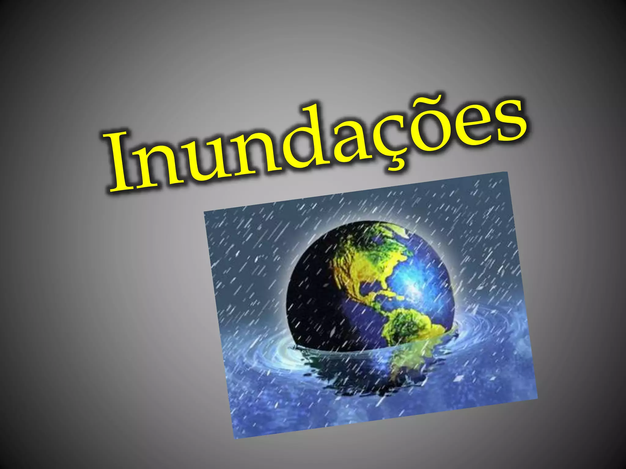 Inundações ocorrem quando há acúmulo excessivo de água em locais secos, podendo ser causadas por chuvas intensas, tempestades ou falhas estruturais. Elas podem ser lentas ou rápidas e causam danos como erosão, destruição de infraestrutura e colheitas, além de poluição e disseminação de doenças. É importante evitar construções em áreas de risco e aumentar a permeabilidade do solo.
