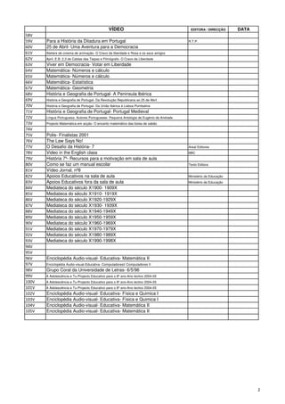 Este documento lista 105 vídeos educativos de diferentes temas como matemática, história, geografia e língua portuguesa. Os vídeos variam em data de produção desde o século 20 até 2010 e foram feitos por diferentes editoras e diretores para apoiar o ensino em Portugal.