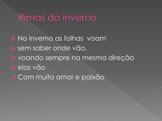 As folhas voam sem rumo no inverno, mas sempre na mesma direção, com amor e paixão. O inverno traz alegria pelo aconchego do amor diário, mas quando as folhas se vão o coração fica vazio. Os ursos hibernam no inverno sonhando com emoção e alegria para dar energia para cada dia.