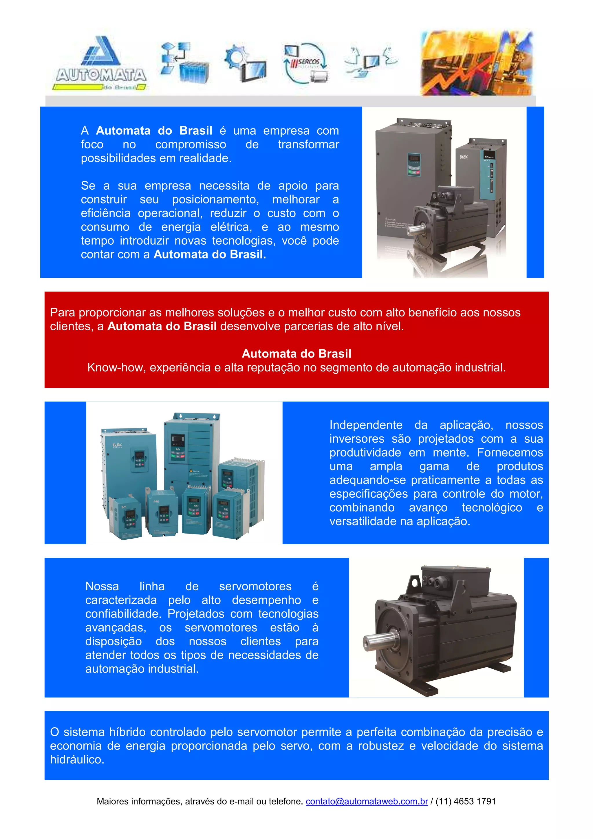 A Automata do Brasil é uma empresa focada em transformar possibilidades em realidade, oferecendo apoio para posicionamento, eficiência operacional e redução de custos de energia. Com parcerias de alto nível, a empresa fornece soluções de automação industrial, incluindo inversores e servomotores de alto desempenho. Seus produtos são projetados para atender diversas especificações, combinando tecnologia avançada com versatilidade.