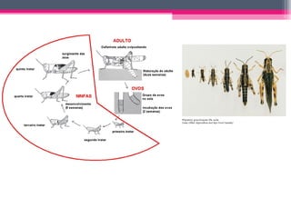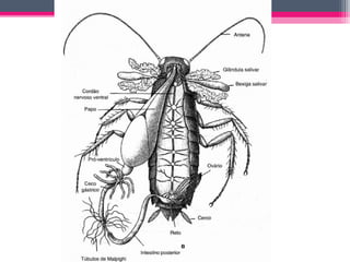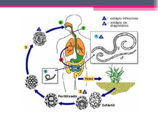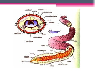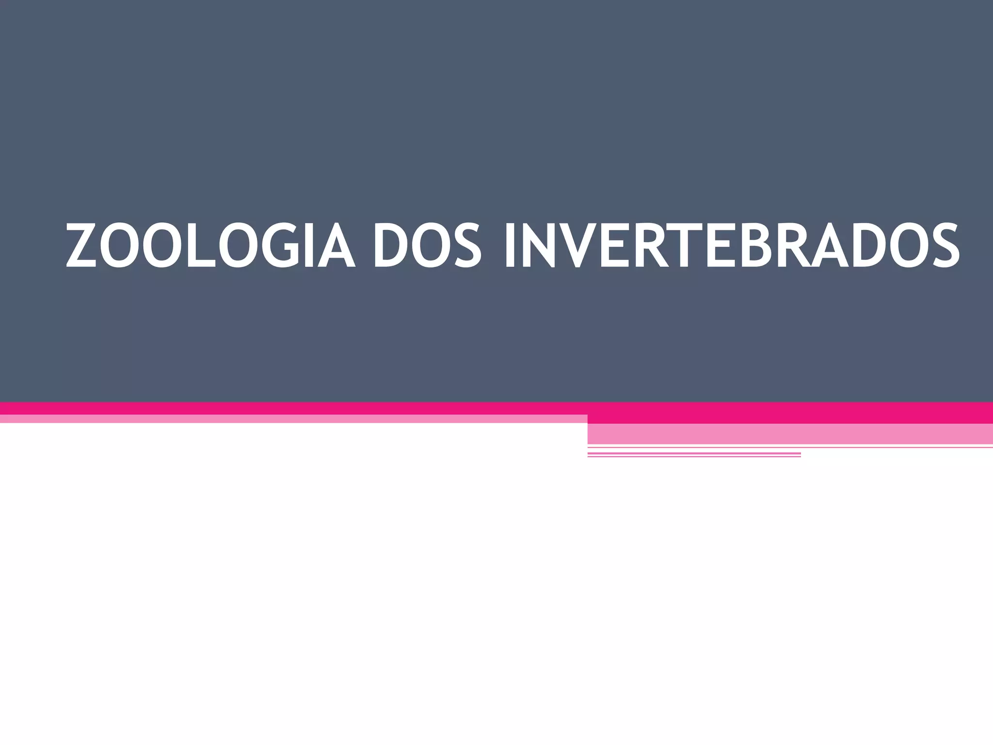 O documento descreve as principais características dos invertebrados, incluindo: 1) Os filos possuem características como simetria, número de tecidos embrionários e presença ou ausência de cavidade corporal; 2) Exemplos de classes são apresentados para os filos Cnidaria, Platyhelminthes, Nematoda e Mollusca; 3) Doenças causadas por parasitas como a esquistossomose e ascariase são brevemente descritas.