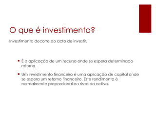 O documento discute o conceito de investimento, incluindo que é a aplicação de recursos para obter retorno financeiro proporcional ao risco. Ele lista tipos de investimentos como financeiros, empresariais e alternativos, e fatores como risco, horizonte temporal e diversificação que afetam o retorno. Finalmente, discute onde investir e perfis de investidores.