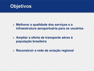 O documento descreve planos para melhorar a infraestrutura aeroportuária e ampliar o acesso ao transporte aéreo no Brasil por meio de (1) novas parcerias público-privadas, (2) fortalecimento e expansão da aviação regional, e (3) aprimoramento regulatório. Os investimentos totais são estimados em R$11,4 bilhões.